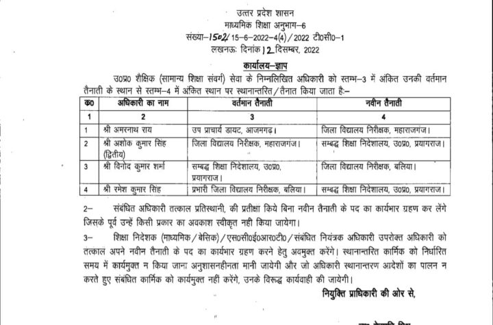 लखनऊ/महराजगंज कल चार  शिक्षा अधिकारियो के ताबदले  हुए जिनमेसे कई  वर्षों से एक ही कुर्सी पर अच्छे काम का हवाला ...