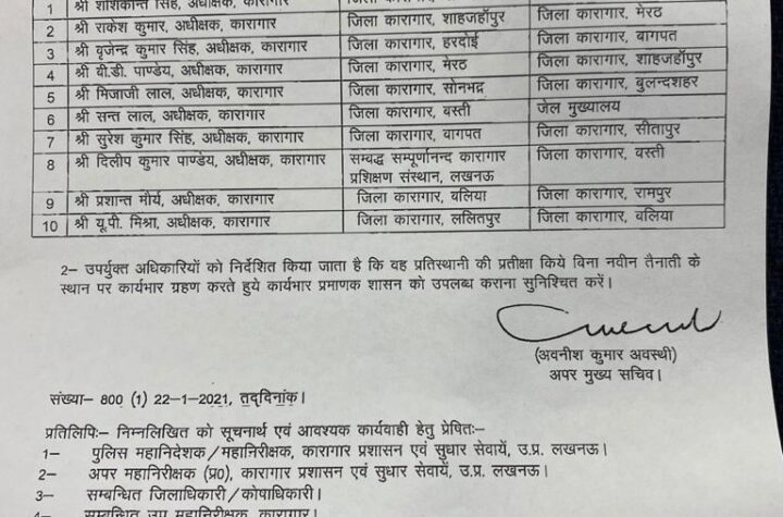 लख़नऊ/हेड शासन द्वारा  10 जेल अधीक्षकों का स्थानान्तरण हुआ जिसमे   सोनभद्र,   बागपत,   ललितपुर, बलिया, गोंण्डा,शाहजहांपुर     मेरठ, हरदोई, बस्ती , ...